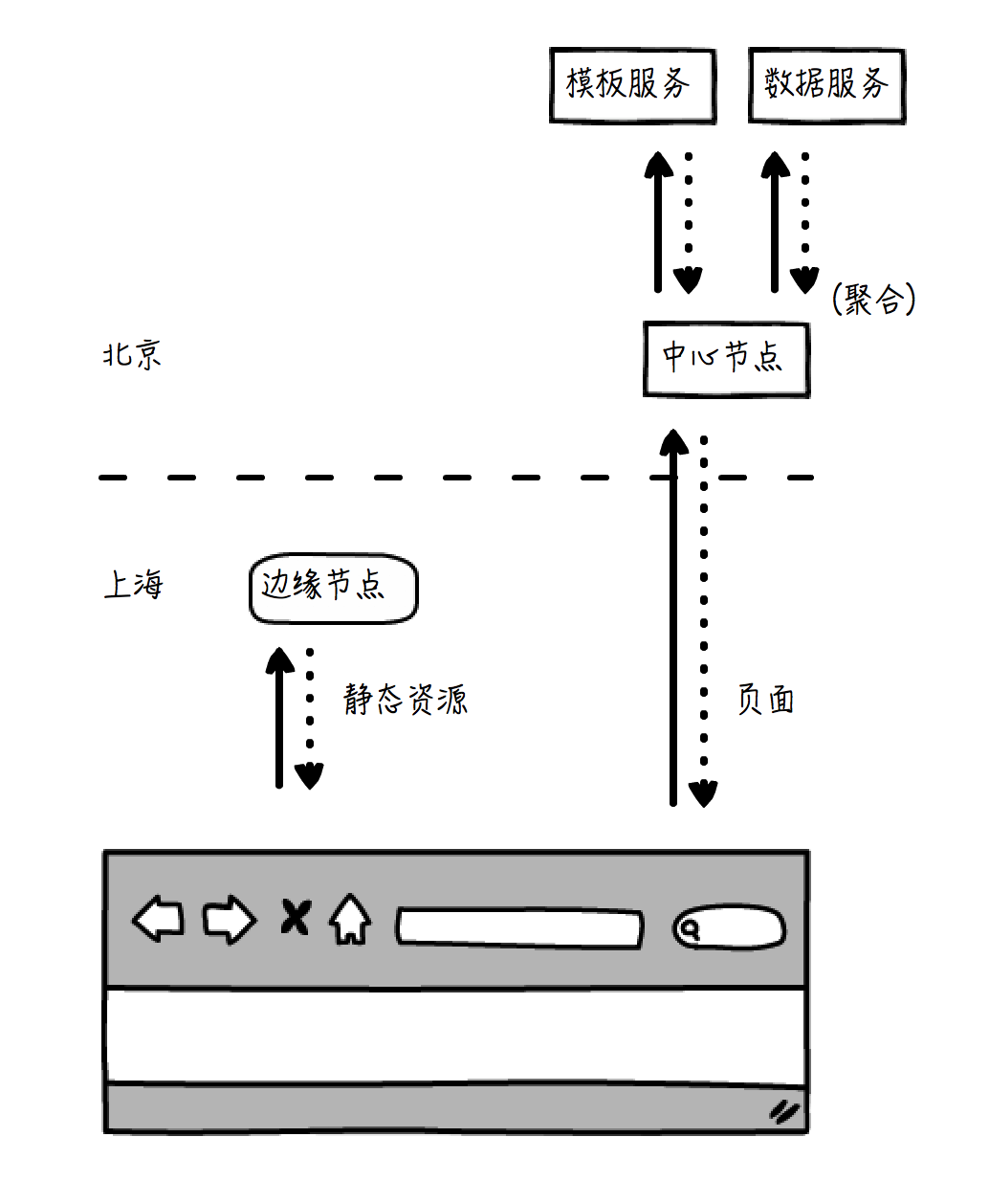 你看上面这个例子,浏览器在上海,模板和静态资源从本地的上海节点获取,而数据异步从北京的中心节点获取。这种方式下,静态资源的访问是比较快的,而为了保证一致性,数据是从北京的中心节点获取的,这个速度会慢一些。在模板抵达浏览器以后,先展示一个等待的效果,并等待数据返回。在数据也抵达浏览器以后,则立即通过 JavaScript 进行客户端的聚合,展示聚合后的页面。