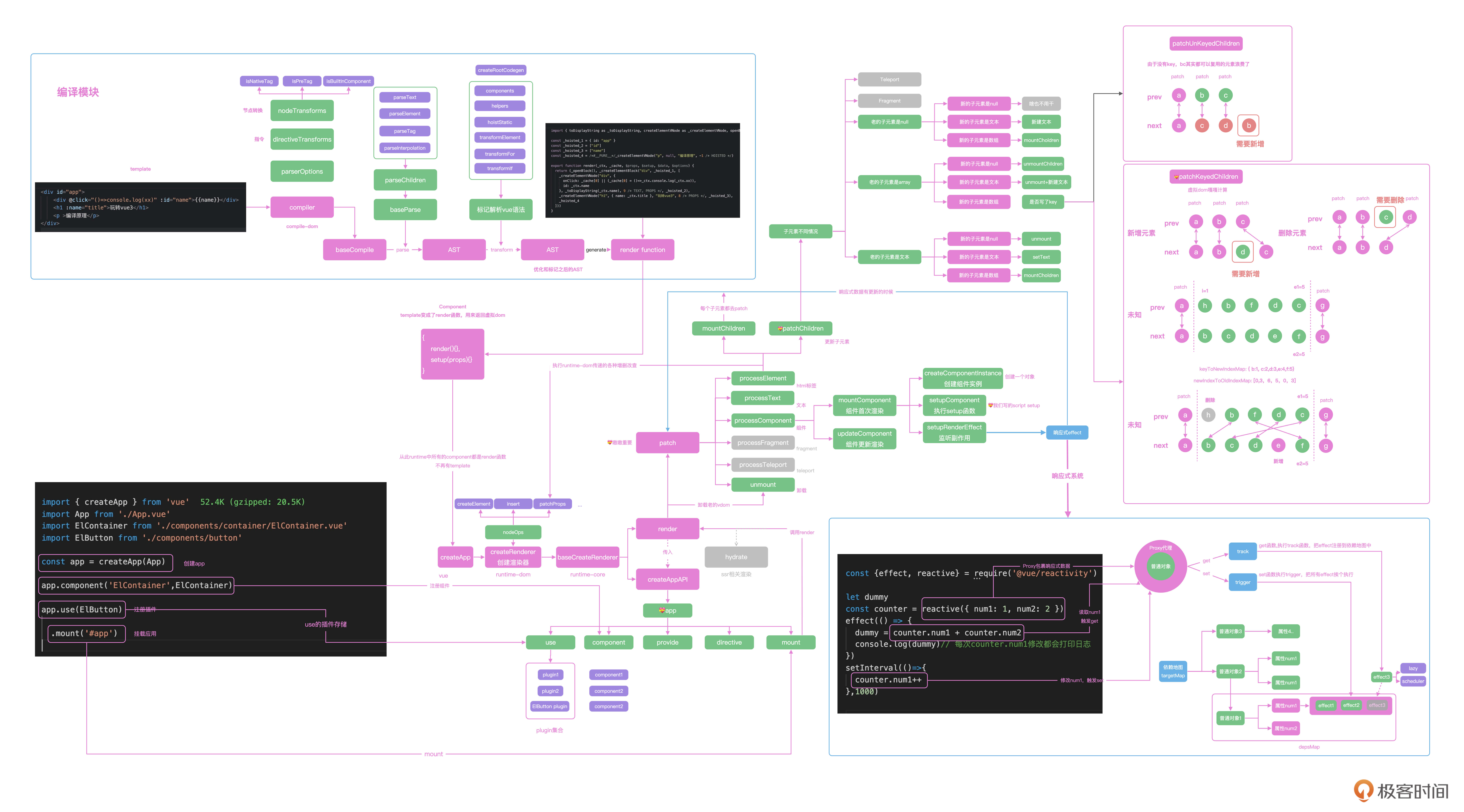最终,render函数会和我们写的setup函数一起组成组件对象,交给页面进行渲染。后面我特意为你绘制了一幅Vue全流程的架构图,你可以保存下来随时查阅。