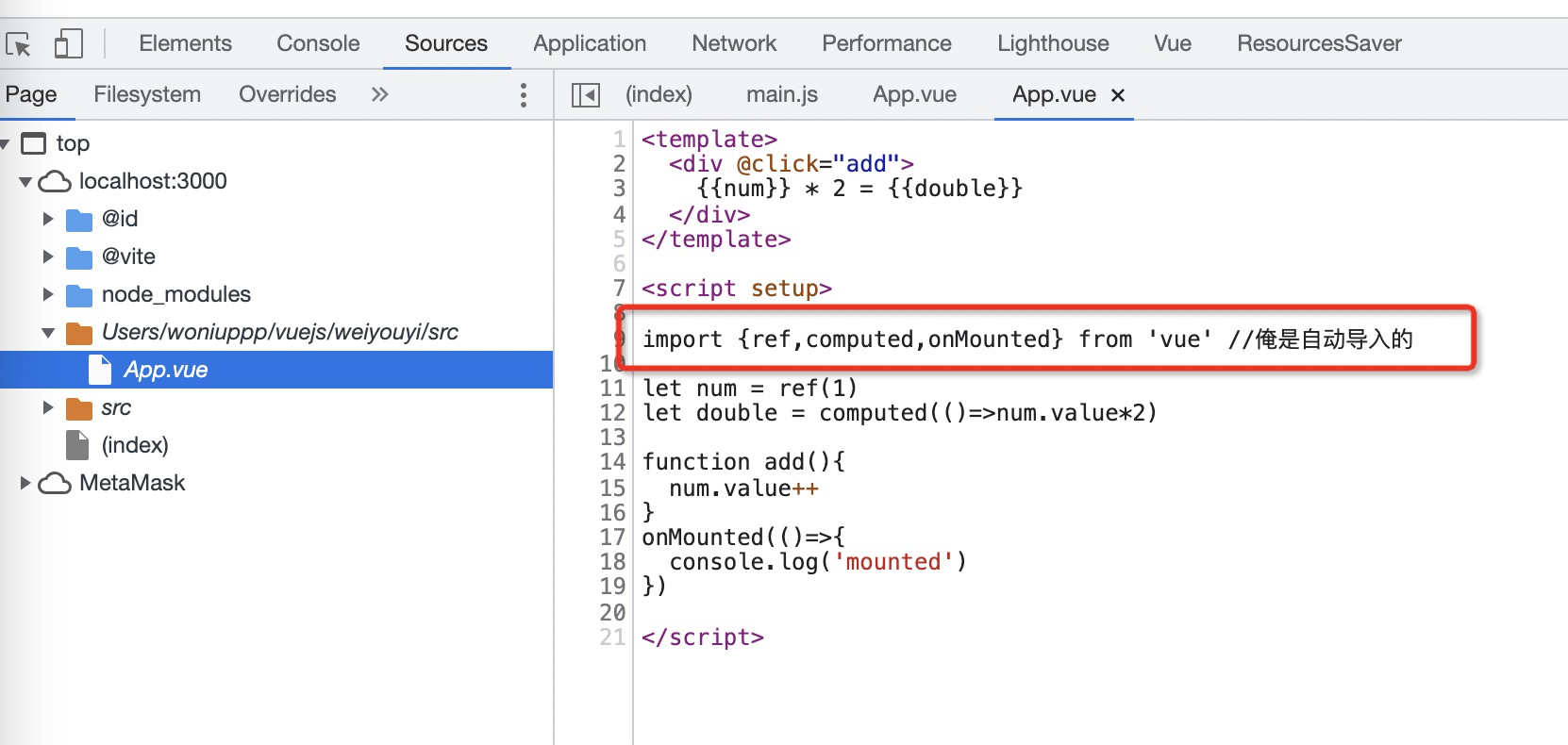 接着,我们在项目的src目录下新建App.vue。下面的代码实现了一个简易的累加器,并且还会在onMount之后打印一条信息,这里的ref、computed和onMounted都是没有导入的。我们在浏览器就能看到页面可以正常显示,这时我们在浏览器调试窗口的sources页面中,就可以看到App.vue的代码已经自动加上了import语句。