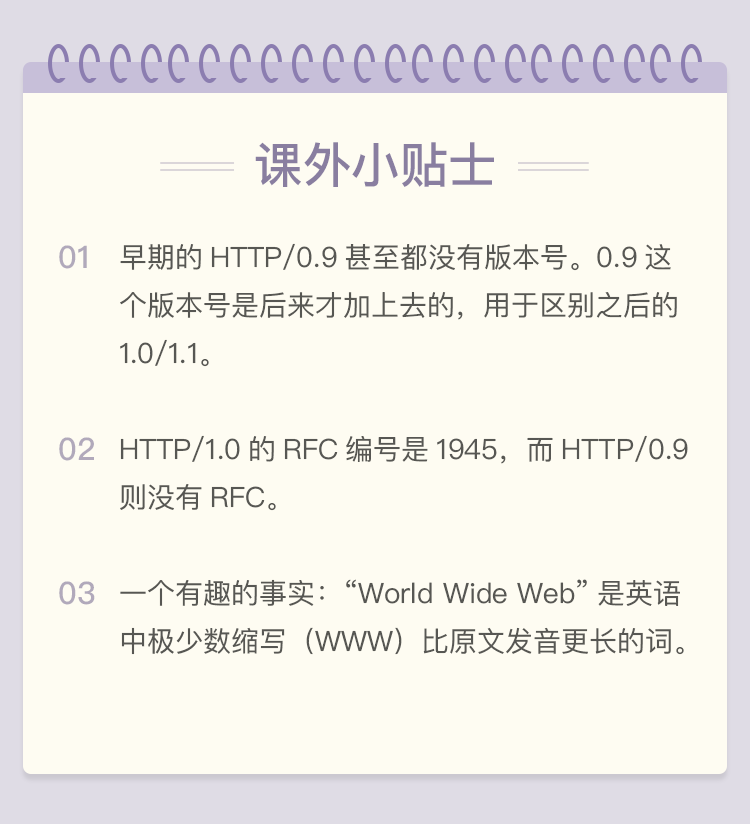 今天我和你一起跨越了三十年的历史长河,回顾了HTTP协议的整个发展过程,在这里简单小结一下今天的内容: