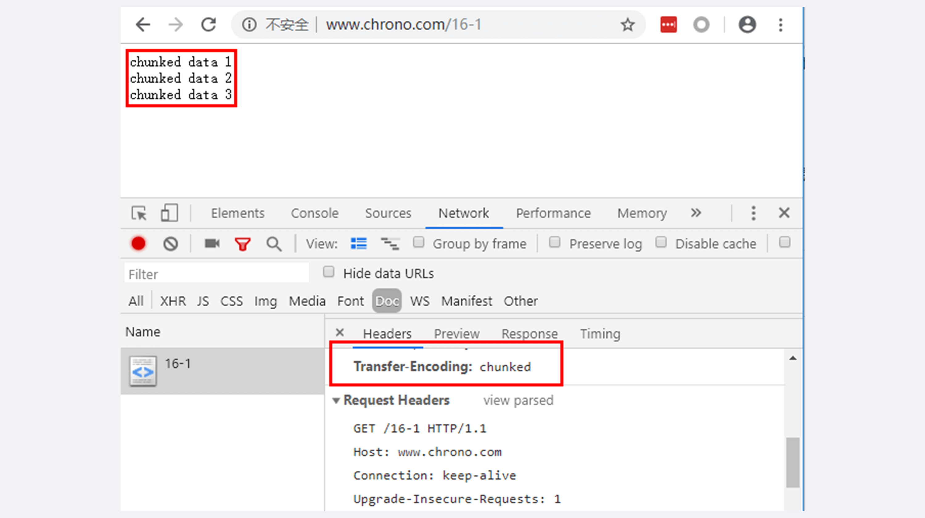 实验环境里的URI“/16-1”简单地模拟了分块传输,可以用Chrome访问这个地址看一下效果: